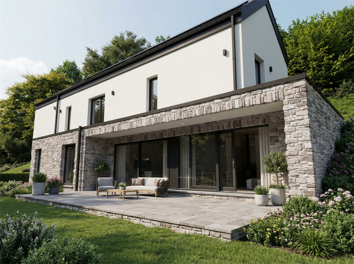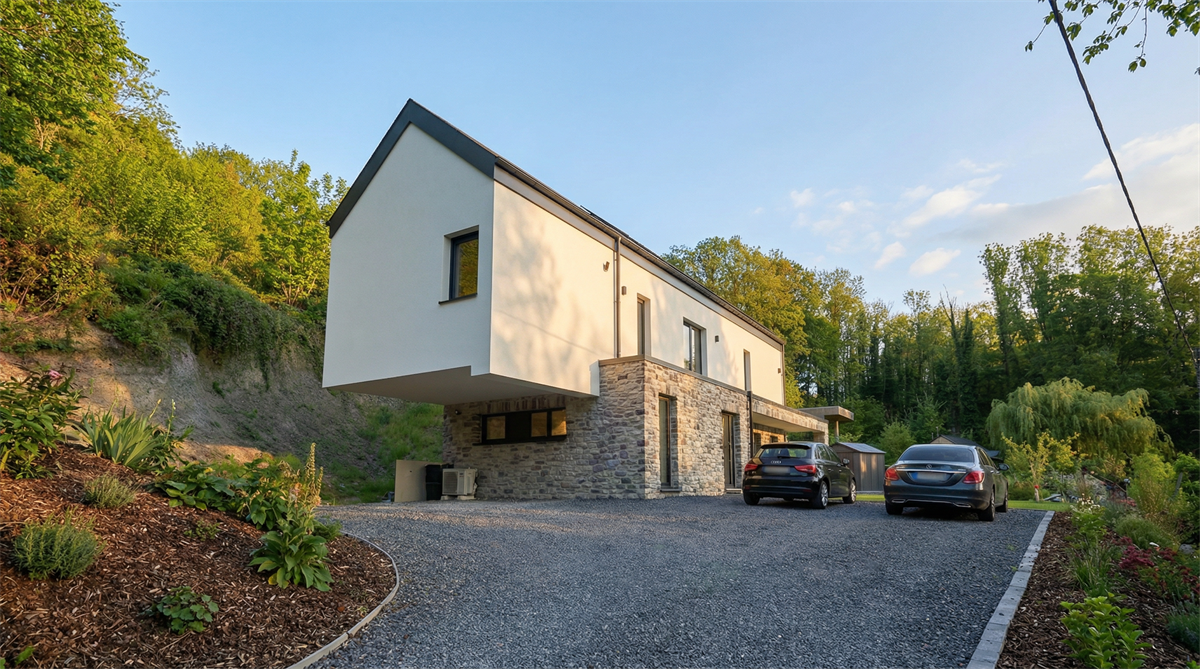 Cette habitation est sans conteste l'un des défis les plus difficile que j'ai eu à relever durant ma carrière car elle a du être érigée sur un terrain très hostile sur lequel une ruine était présente. De plus nous nous trouvions dans le bas d'une butte qui était stabilisée en partie grâce à cette fameuse ruine. Le défi a été de garder la butte en place sans avoir recours à la méthodologie trop coûteuse des parois berlinoises. Nous avons donc pris le pari de conserver les murs de caves de l'habitation en ruine pour garder la stabilité du talus. L'autre défi de taille était la gestion des étanchéités de tous ces murs enterrés pour lesquels l'accessibilité était très réduite.