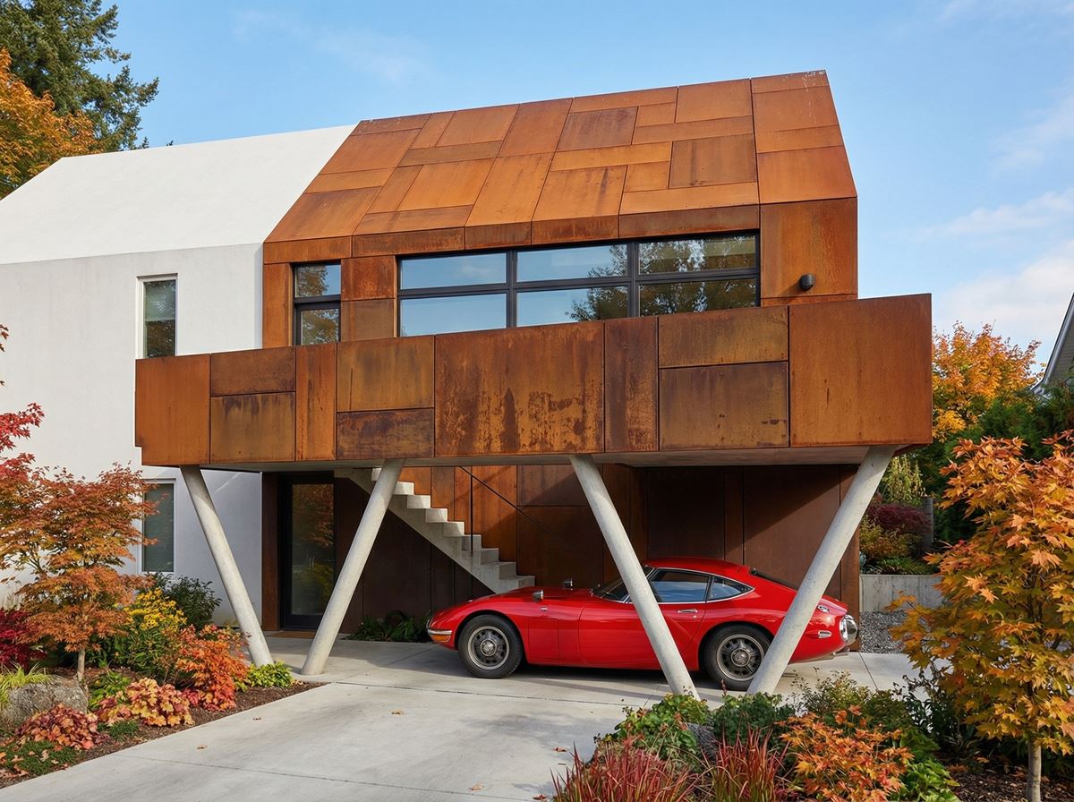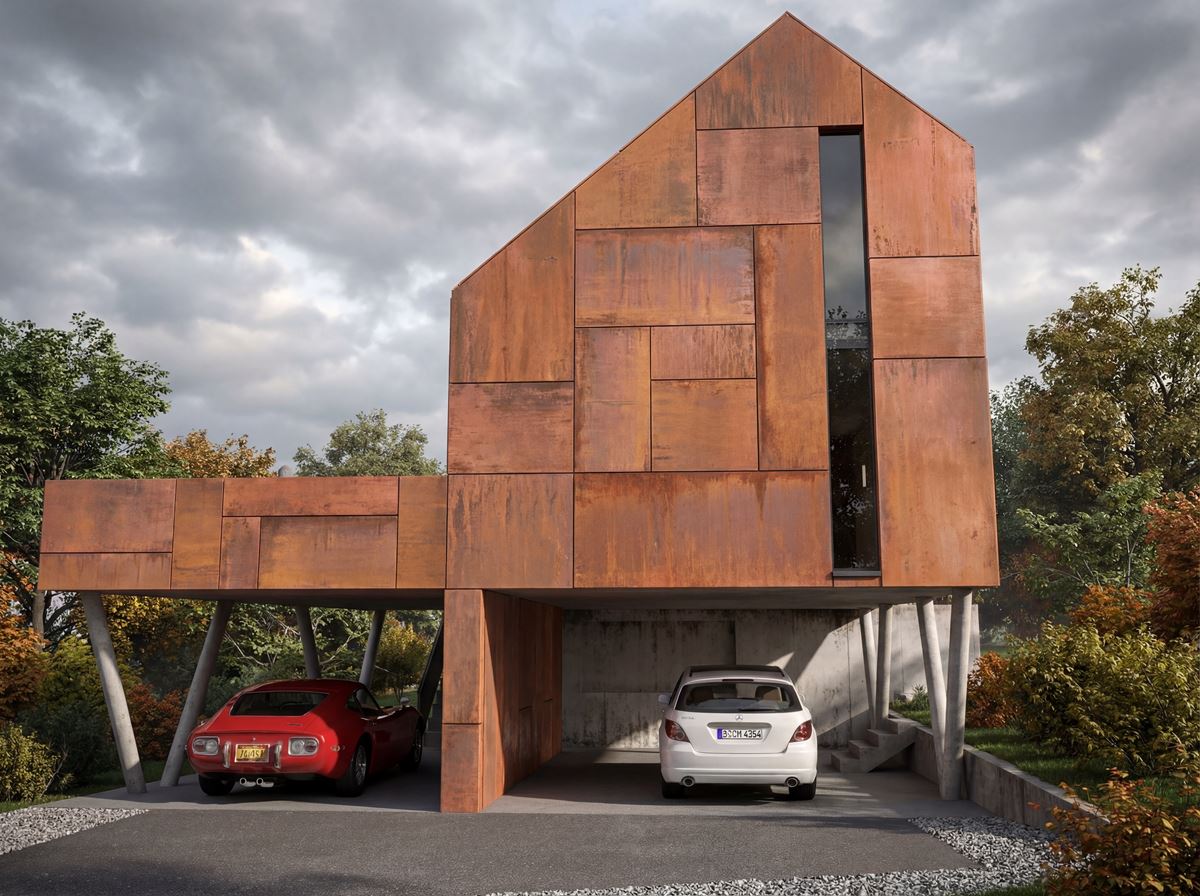 La façade est habillée d’un bardage en acier corten travaillé en calepinage façon mosaïque. Les plaques, assemblées avec rigueur, composent une trame vibrante qui capte la lumière et fait évoluer la perception du volume au fil de la journée. Ce choix matérialise une tension volontaire entre ruralité et modernité : un matériau industriel, assumé, posé dans un environnement villageois, sans compromis décoratif.