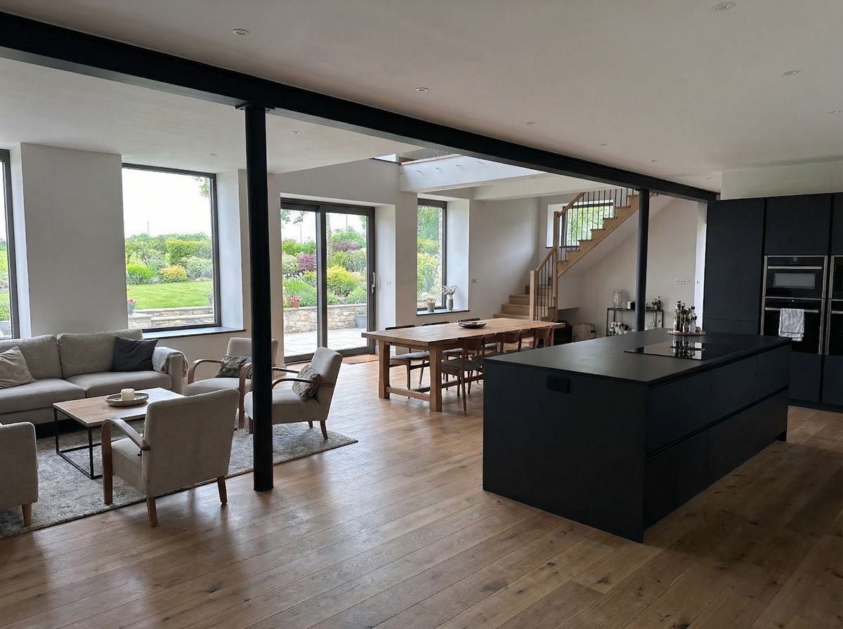 À l’inverse, l’intérieur opère une rupture nette. La structure existante sert de cadre à un espace de vie contemporain, lumineux et ouvert. Les nouveaux aménagements s’organisent sous la charpente conservée et mettent en valeur la profondeur du volume initial. Les espaces de vie occupent le rez-de-chaussée tandis que les chambres prennent place sous toiture, profitant de la hauteur et de la lumière zénithale.