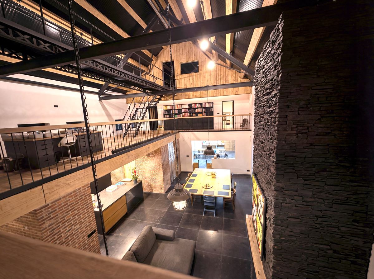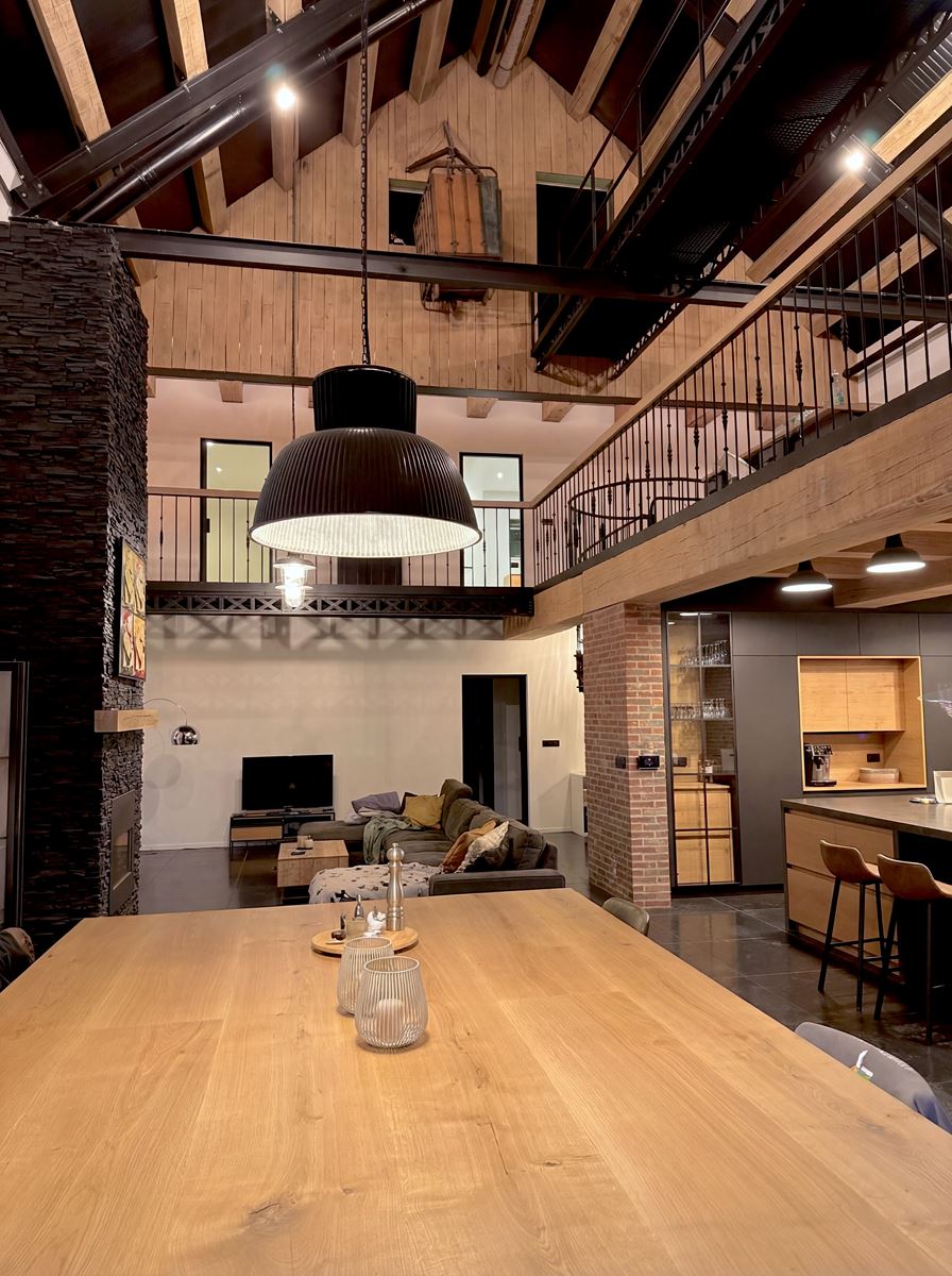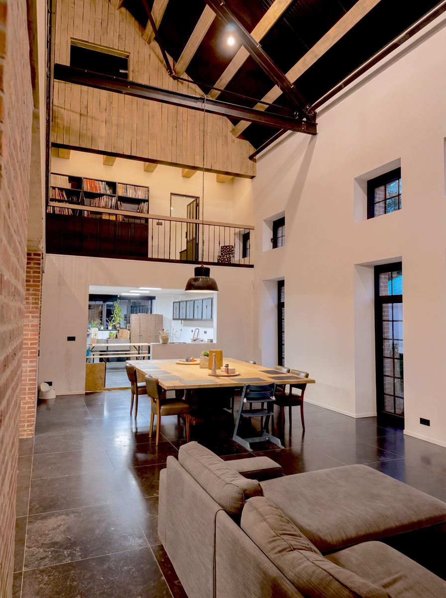 À l’intérieur, la stratégie est volontairement inverse. Là où l’extérieur exprime la continuité patrimoniale, l’espace intérieur assume un mode de vie contemporain. L’ensemble du projet s’appuie sur la volumétrie existante : hauteur importante, profondeur de façade et portée structurelle deviennent des qualités d’habiter. Les espaces de vie sont largement ouverts, organisés en double hauteur et prolongés par une mezzanine afin de maintenir la perception du volume originel. La circulation de la lumière naturelle, rendue possible par les grandes baies conservées, structure l’organisation intérieure.