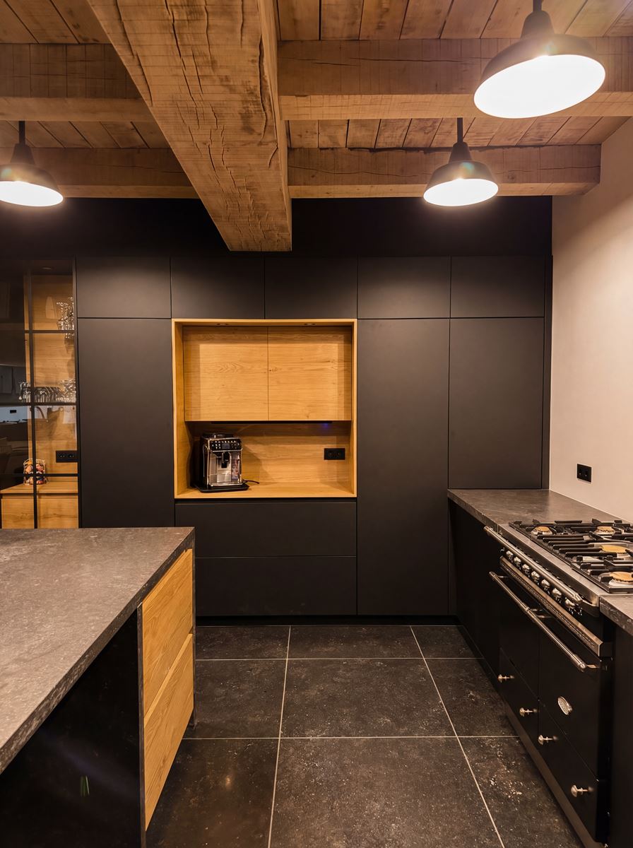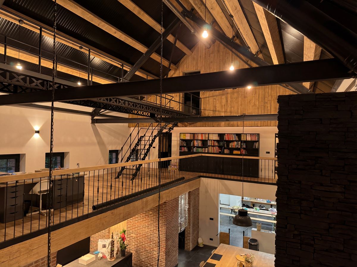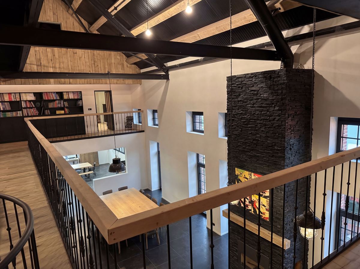 À l’intérieur, la stratégie est volontairement inverse. Là où l’extérieur exprime la continuité patrimoniale, l’espace intérieur assume un mode de vie contemporain. L’ensemble du projet s’appuie sur la volumétrie existante : hauteur importante, profondeur de façade et portée structurelle deviennent des qualités d’habiter. Les espaces de vie sont largement ouverts, organisés en double hauteur et prolongés par une mezzanine afin de maintenir la perception du volume originel. La circulation de la lumière naturelle, rendue possible par les grandes baies conservées, structure l’organisation intérieure.